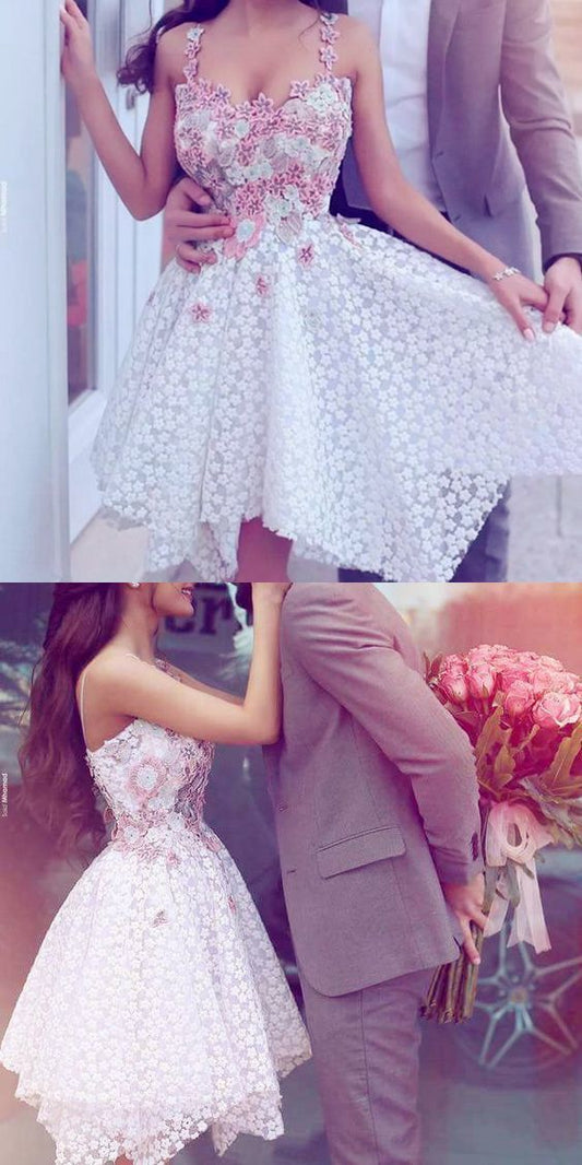 A-Line Straps Asymmetrical Ivory Lace Homecoming Dress with Appliques cg212
