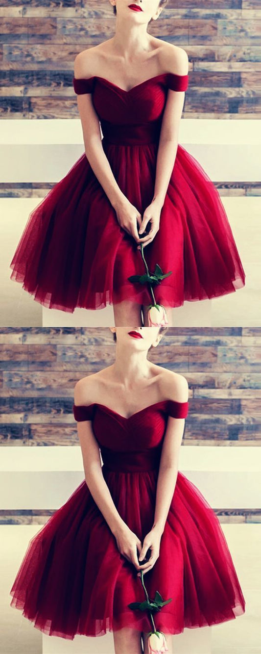 Burgundy Tulle V-neck Off The Shoulder Bridesmaid Dresses Knee Length homecoming dress cg625