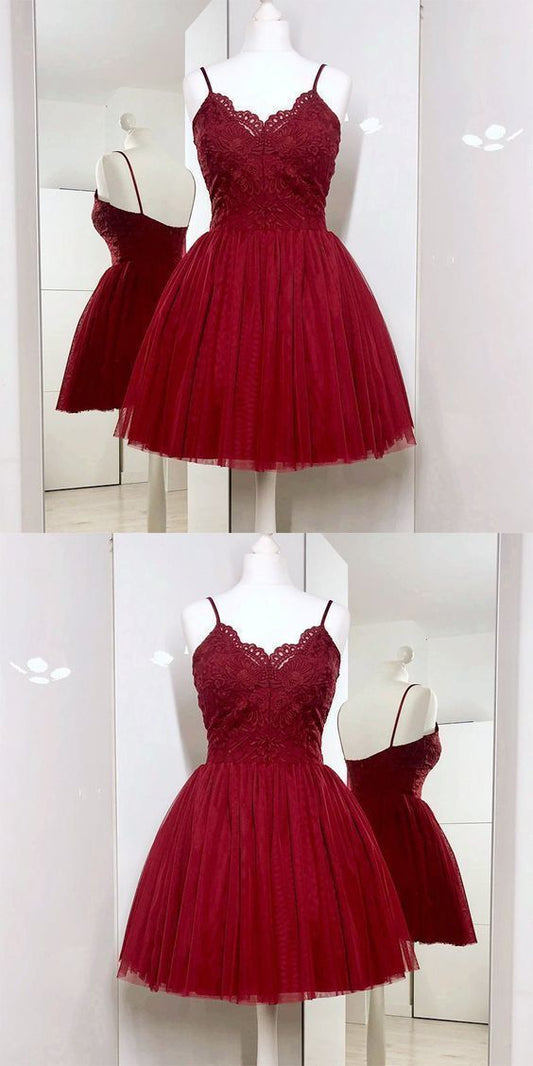Spaghetti Straps A-Line Burgundy Tulle Short homecoming Dress with Lace cg866
