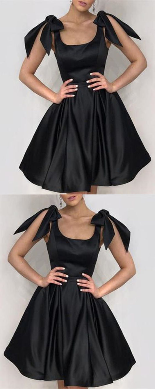 Elegant Black Bow Shoulders Ruffles Satin Homecoming Dresses cg874