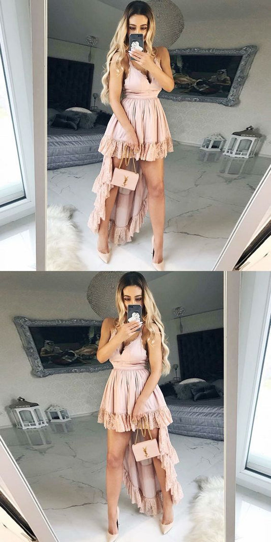 A-Line Spaghetti Straps High Low Blush Homecoming Dress with Lace cg932