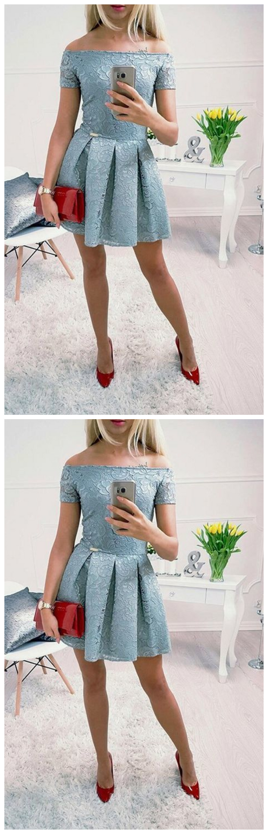 Dusty Blue Off Shoulder Lace Homecoming Dresses cg952