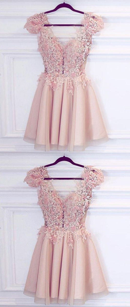 A-Line Deep V-Neck Cap Sleeves Pink Tulle Short Homecoming Dress with Appliques cg1051