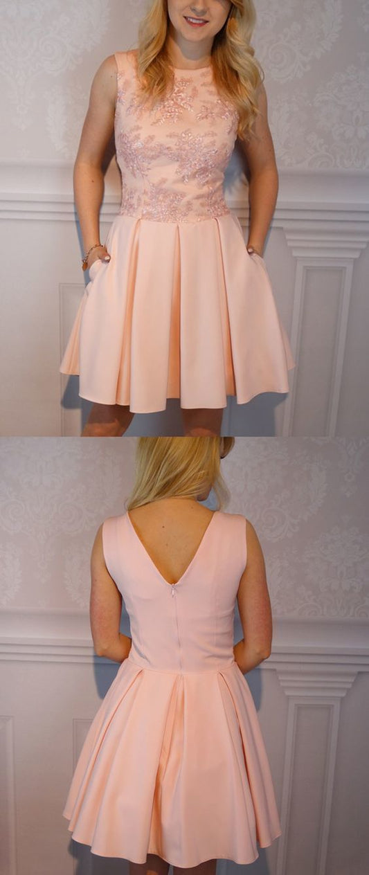 A-Line Short Pink Satin Homecoming Dress with Applique cg1106