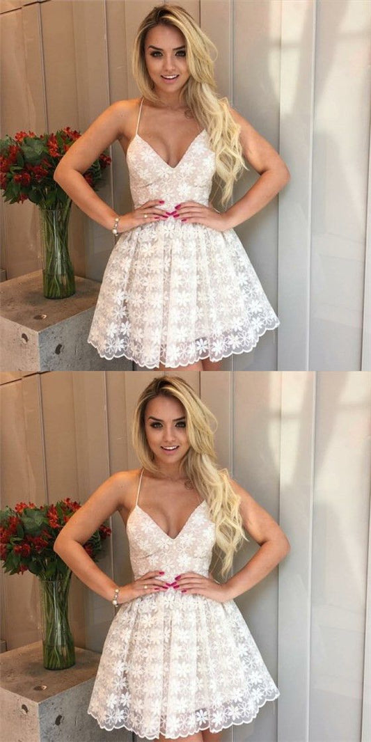 Sexy V-neck Spaghetti Straps Short White Lace Homecoming Dresses cg1258