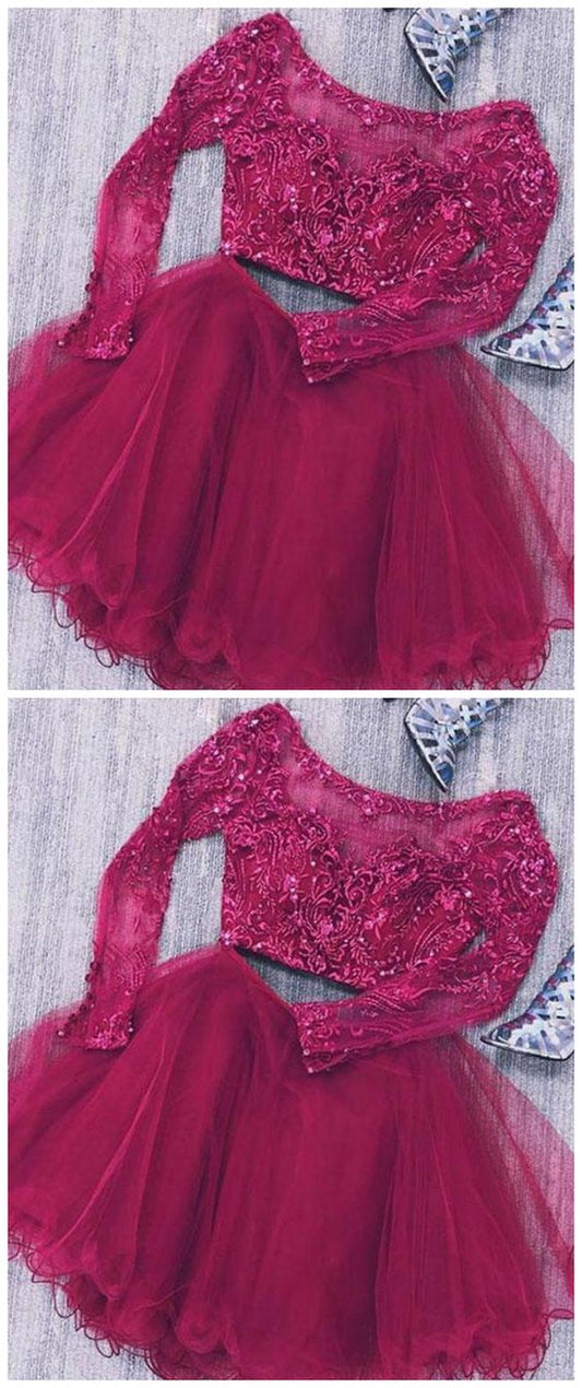 Two Piece Long Sleeves Tulle Short Homecoming Dress with Lace Beads cg1507