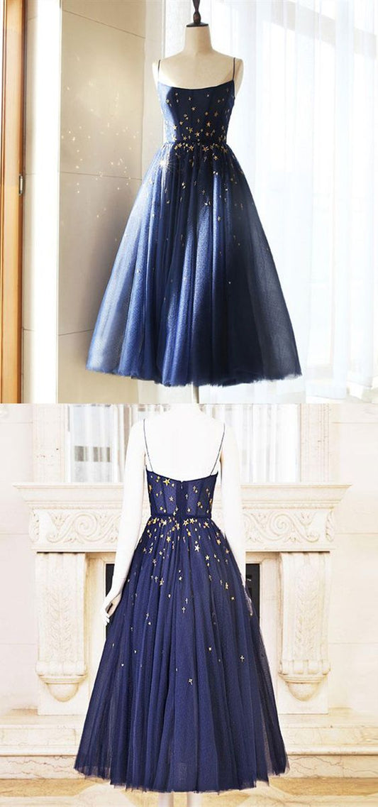 A Line Spaghetti Straps Navy Blue Tea Length Homecoming Dress With Sequins cg2301
