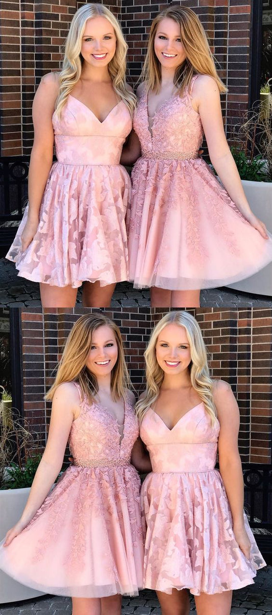 pink v neck homecoming dress cg3078