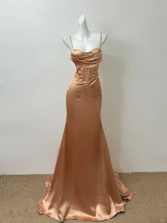 Gold Cyberpunk Wasteland Dress Metallic Simple Fashion Elegant Long Satin Floor-Length Train Backless Sexy Mermaid Slim Ball Gown Evening Gown Prom Dress Birthday Party Dress gh3907
