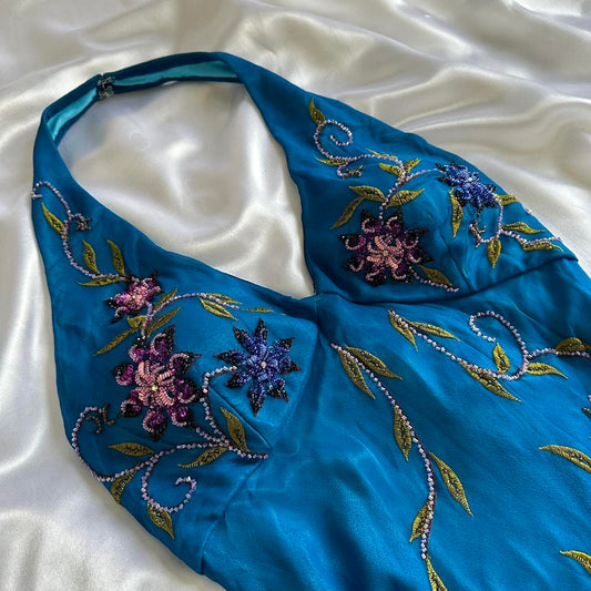Blue Gorgeous Flowing Retro Beautiful Elegant Delicate Floral Beaded Long Chiffon Ball Gown Evening Gown Party Dress Prom Dress gh3904
