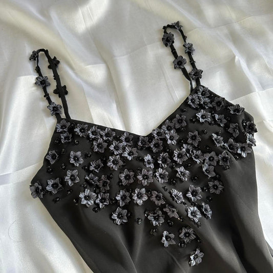 Black Beautiful Vintage Elegant Exquisite Floral Beading 3D Flower Applique Asymmetric Ruffle Dress Midi Chiffon Homecoming Dress Prom Dress Evening Dress Party Dress Graduation Dress gh3940
