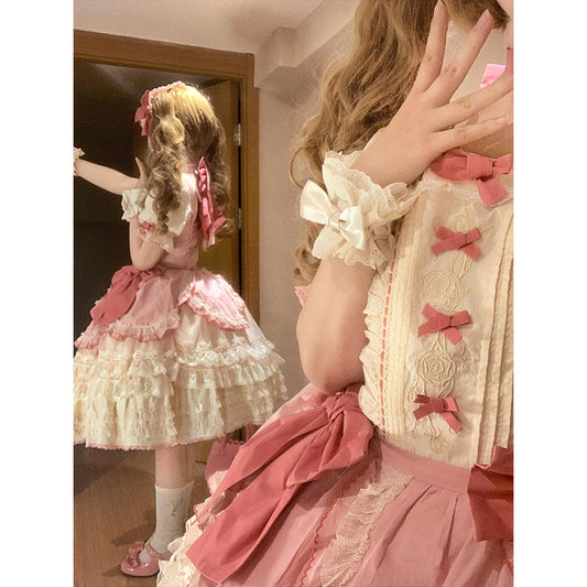 Sweet Ball Gown Square Neck Short Sleeves Gothic Pink Lace 16th Birthday Dress Lolita Dress Birthday Outfits W1118