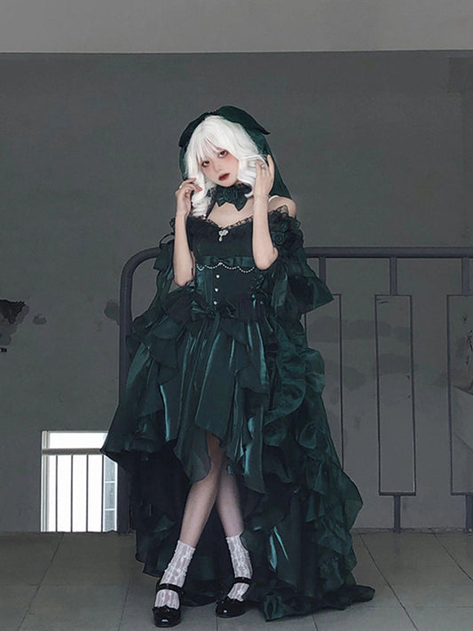 Princess Ball Gown Off The Shoulder Short Sleeves Dark Green High Low Floral 16th Chiffon Birthday Dress Lolita Dress 18th Birthday Outfits W1199