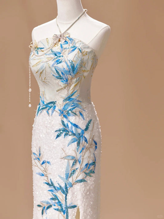 White Luxury Gorgeous Shiny Unique Fashion Elegant Exquisite Floral Bamboo Beads Sequins Suspender Long Ball Dress Evening Dress Bridal Wedding Reception Dress Prom Dress gh4026
