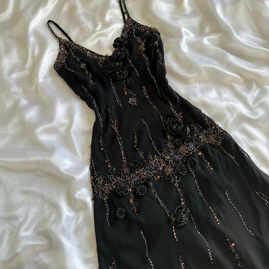 Black Romantic Elegant Delicate Blue Floral Beaded Long Chiffon Ball Gown Evening Gown Birthday Vacation Wedding Guest Party Dress Prom Gown gh4010