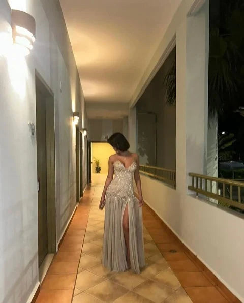 Champagne Color Sparkling Sweetheart Neck Elegant Long Slit Sequin Chiffon Ball Gown Evening Dress gh4185