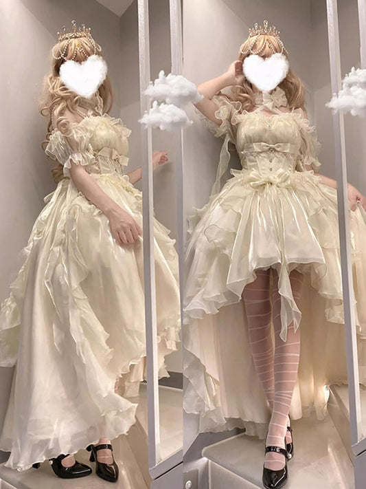 Beautiful High Low Off The Shoulder Short Sleeves Ivory Floral 16th Chiffon Birthday Dress Lolita Dress 18th Birthday Outfits W1221
