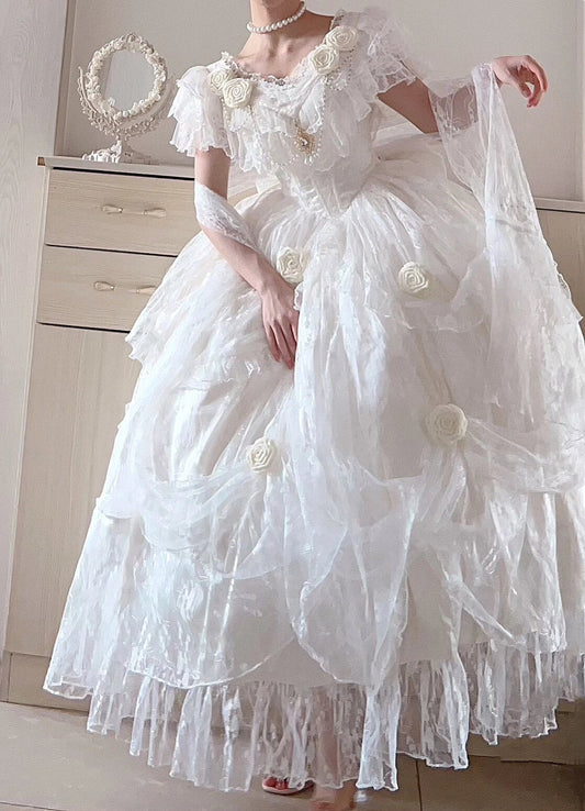 Retro Ball Gown Off The Shoulder Short Sleeves White Rose Floral 16th Chiffon Birthday Dress Lolita Dress 18th Birthday Outfits W1245