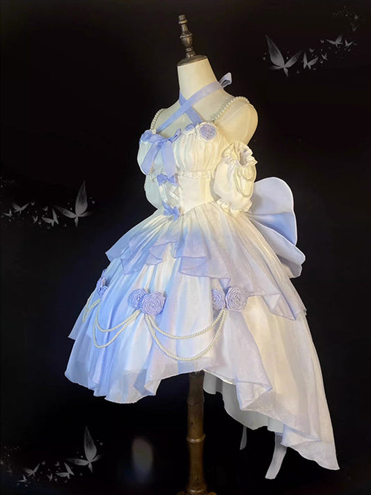 Vintage Ball Gown Spaghetti Straps Short Chiffon Summer 18th Birthday Dress High Low Ombre Blue Lolita Dress Birthday Outfits W1230