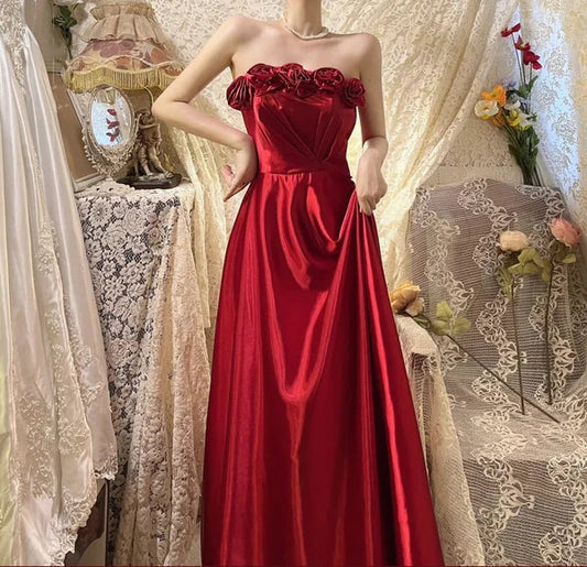 Red Vintage Floral Long Satin Prom Dress Birthday Party Dress Evening Dress gh4413