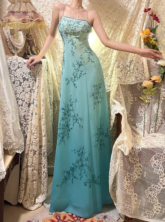 Blue Vintage Elegant Floral Long Satin Floor Length Ball Gown Evening Dress gh4415