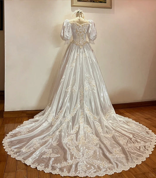 __Ivory white gorgeous beaded retro classical oil painting aristocratic girl handmade pearls and embroidery long floor-length satin ball gown evening dress wedding dress gh4543