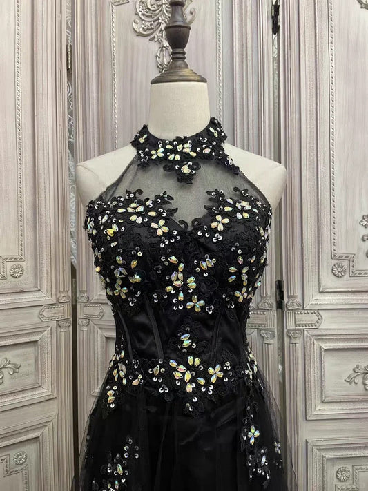 Black floral rhinestone long tulle prom evening gown party dress gh4984