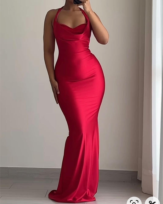 Pretty Mermaid Halter Red Satin Prom Dresses Black Girl Graduation Dress D2544