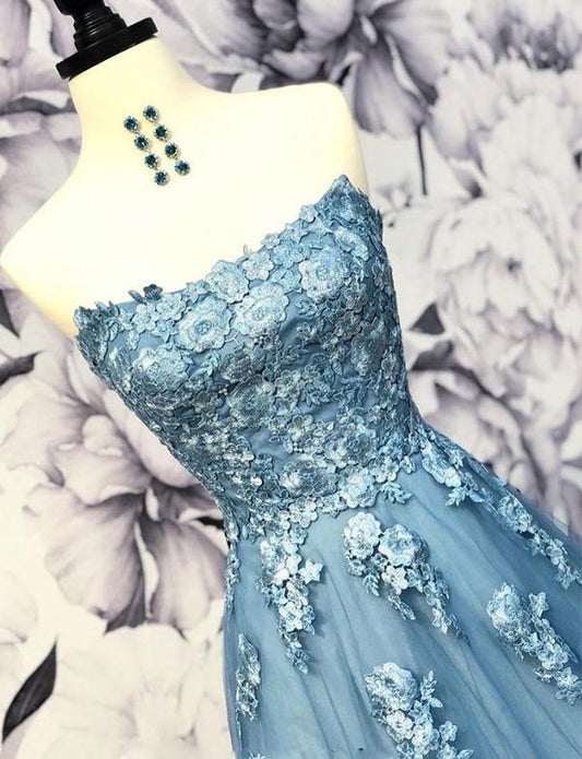 Blue Prom Dresses Long Strapless Evening Party Dresses With Flowers cg2343