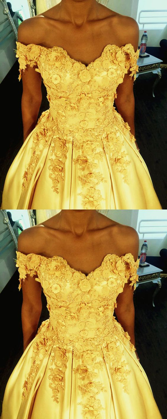 Yellow Satin off shoulder ball gowns prom dress with lace flower beaded cg2955