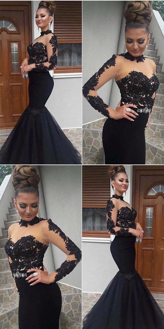 long sleeves mermaid evening dress, elegant black long prom dress, lace appliques formal dress cg3257