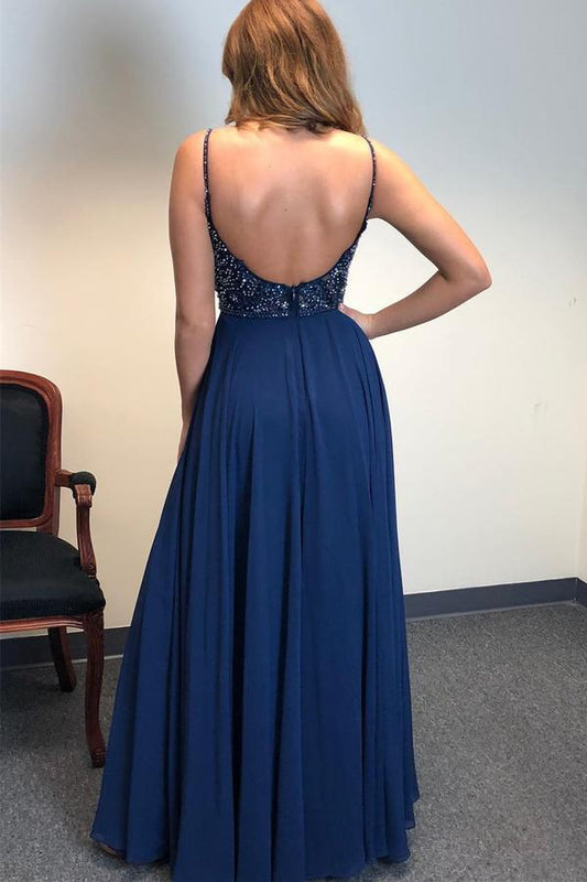 Fashion Spaghetti Straps Backless A-line Navy Long Prom Dress, High Slit Beading Evening Party Gown cg3451