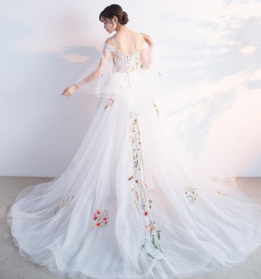 Beautiful White Tulle Long Party prom Dress With Flower Lace Applique, White Evening Gown cg3914