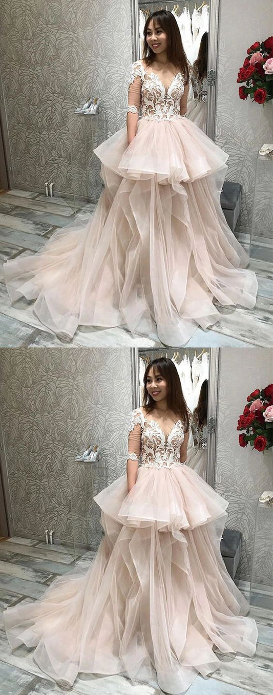 Champagne tulle lace long prom dress, champagne evening dress cg4595