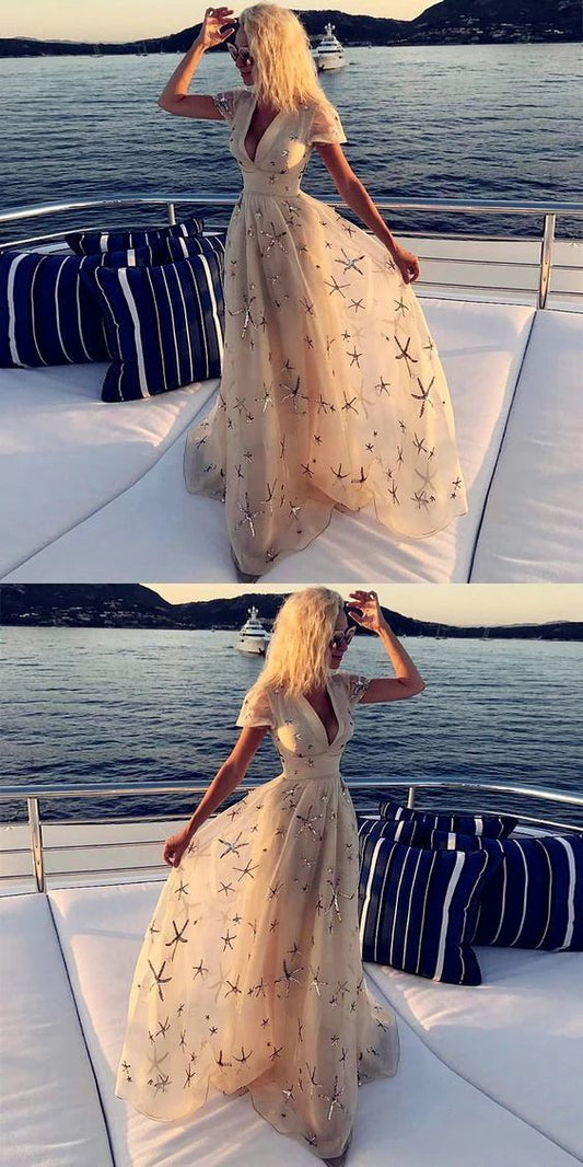 A-line V neck Champagne Prom Dresses With Sleeve Formal Gown Evening Dresses cg4666
