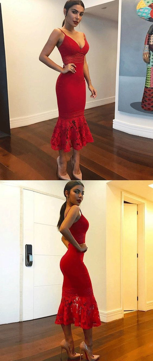 Spaghetti Straps Tea-Length Red Stretch Satin Prom Dress with Lace cg6143
