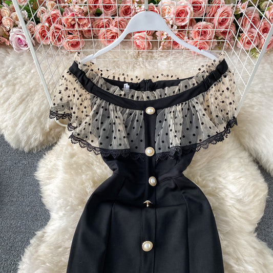 Temperament light mature style one shoulder wave dot mesh dress 2887