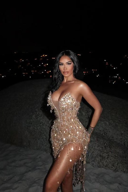 loveedsTM-Silver tassel slit sexy heavy-duty dress-vx