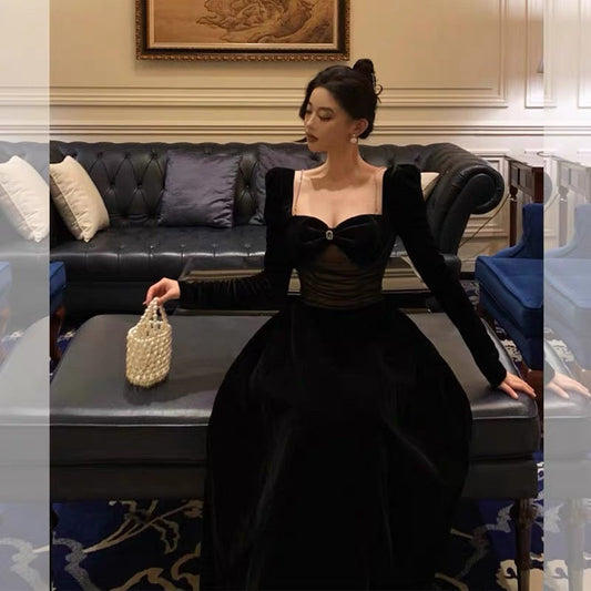 Pretty A Line Square Neckline Long Sleeves Black Velvet Prom Dresses Birthday Outfits Evening Gown SD804
