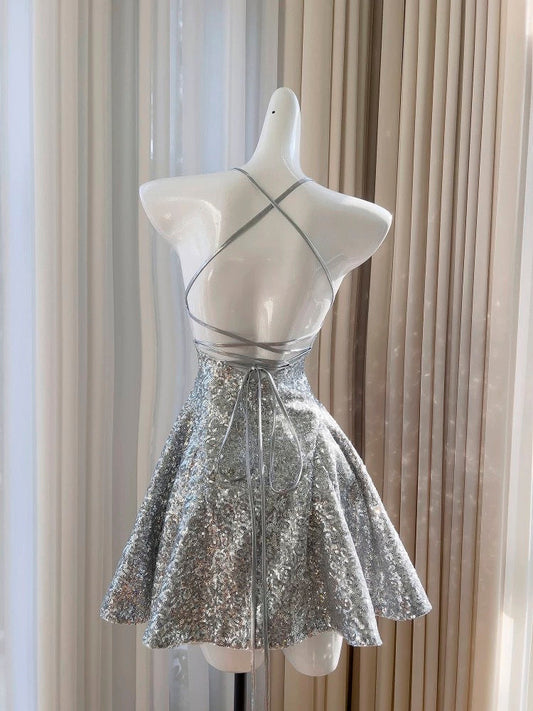 Pretty A line Halter Silver Sequin Summer 16th Birthday Dresses For Teens Hoco Dress Mini 18th Birthday Outfit Cocktail Dresses For Women W899