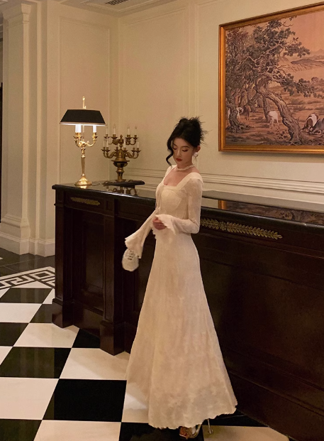 Modest A line Square Long Sleeves White Satin 21st Birthday Dress Party Gown Birthday Outfits Birthday Dress Ideas For Women DP1473