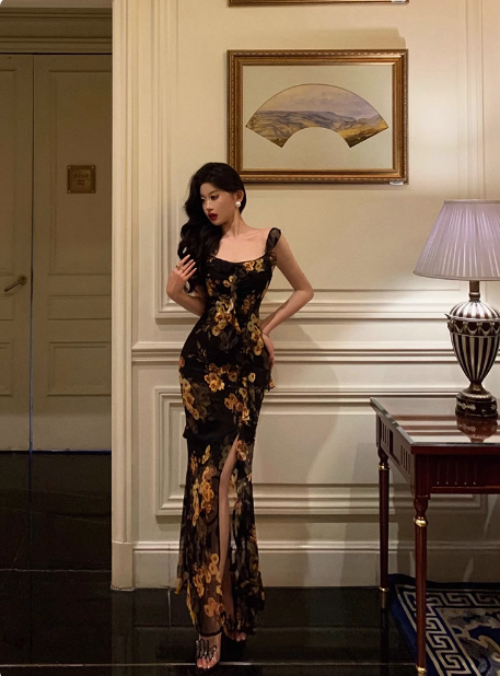 Elegant Mermaid Black Floral Chiffon 18th Birthday Dress Party Gown Birthday Outfits Birthday Dress Ideas For Women DP603
