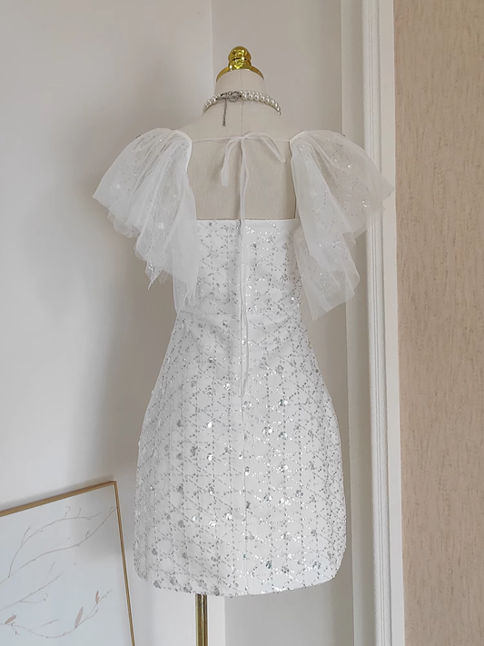 Cute A line Square neckline Tulle White Sequin Party Dress Short Birthday Dresses With Beads SD378