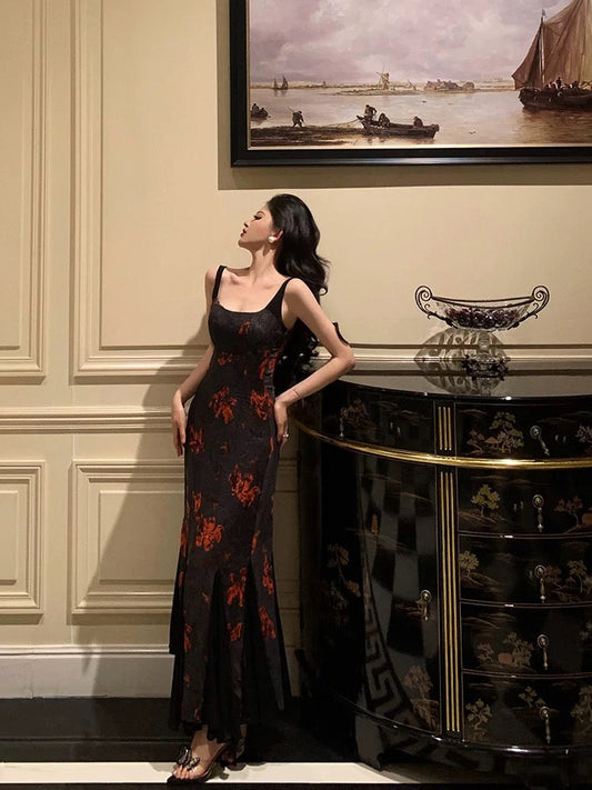 Classy Sheath Straps Black Floral Prom Dresses Birthday Outfits Evening Gown SD1096