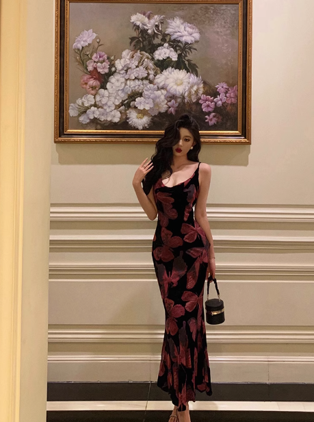 Classy Mermaid Spaghetti Straps Sleeveless Pink Floral Prom Dresses Birthday Outfits SD693