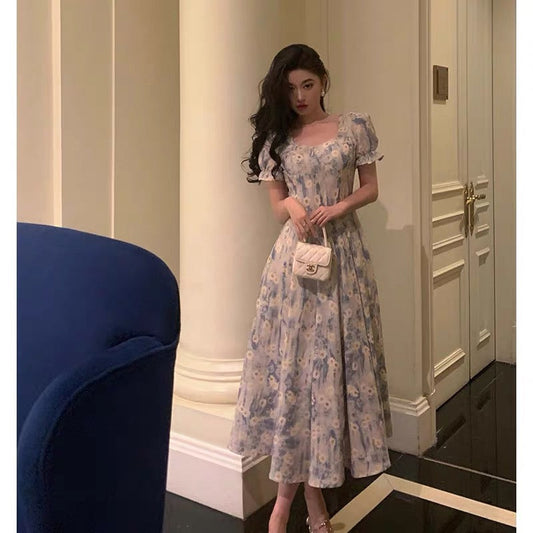 Classy A line Square neckline Blue Chiffon Long Prom Dresses Birthday Outfits Evening Gown SD1013