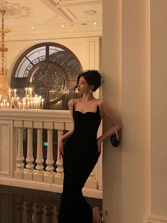 Sexy Sheath Spagetti Straps Black Long Vacation Dress Birthday Dresses SD0066