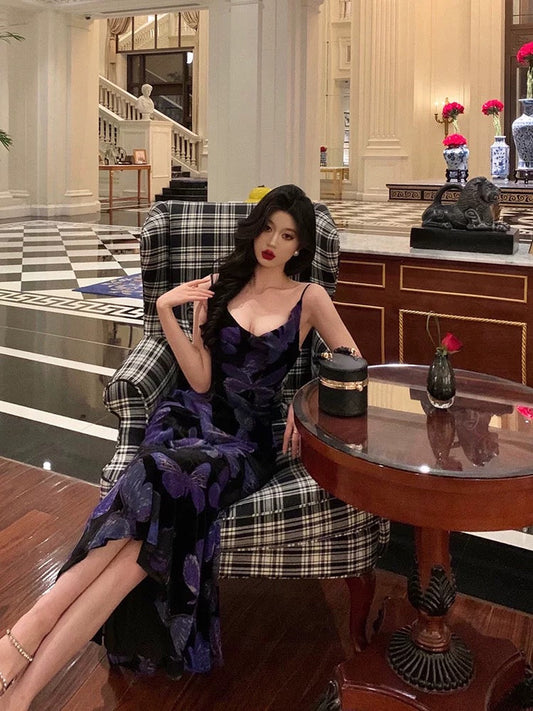 Sexy Sheath Spaghetti Straps Floral Grape Butterfly Fold Long Prom Dresses Birthday Outfits SD612