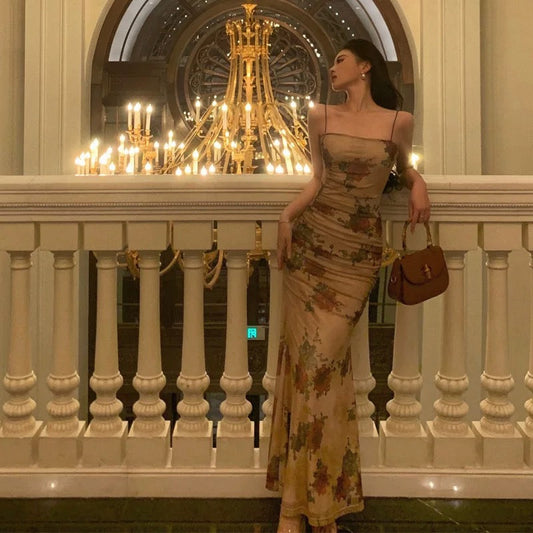 Sexy Sheath Spaghetti Straps Champagne Floral Prom Dresses Birthday Outfits Evening Gown SD922