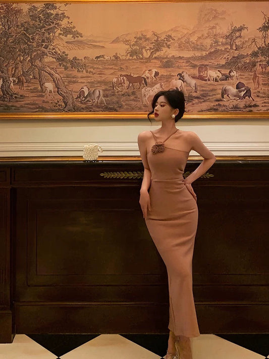 Sexy Sheath Halter Neckline Sleeveless Prom Dresses Birthday Outfits With Flower SD666